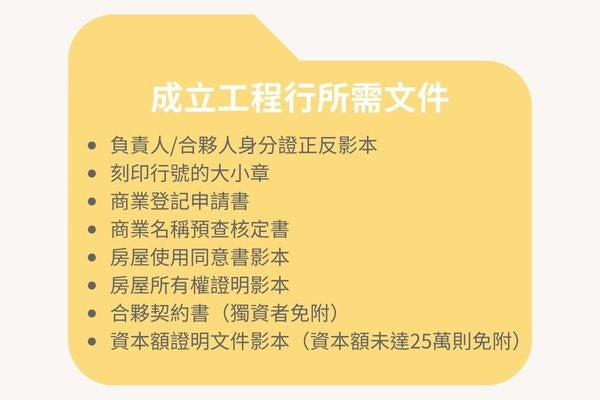 不管是申請成立工程行、企業社或是實業社,除了負責人必須年滿18歲並具行為能力外,申請成立工程行並無其他特別限制,亦無規定資本額門檻,雖然沒有硬性規定資本額,但在準備資本額時仍應以能夠合理設立、順利運行為主,通常小規模行號的初始資本額約10萬即可。
