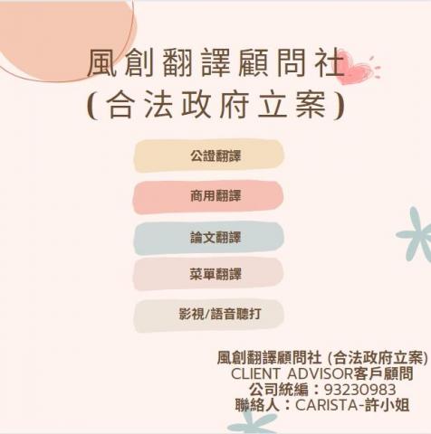 風創翻譯顧問/翻譯證明 (政府立案) 蓋翻譯公司證明章